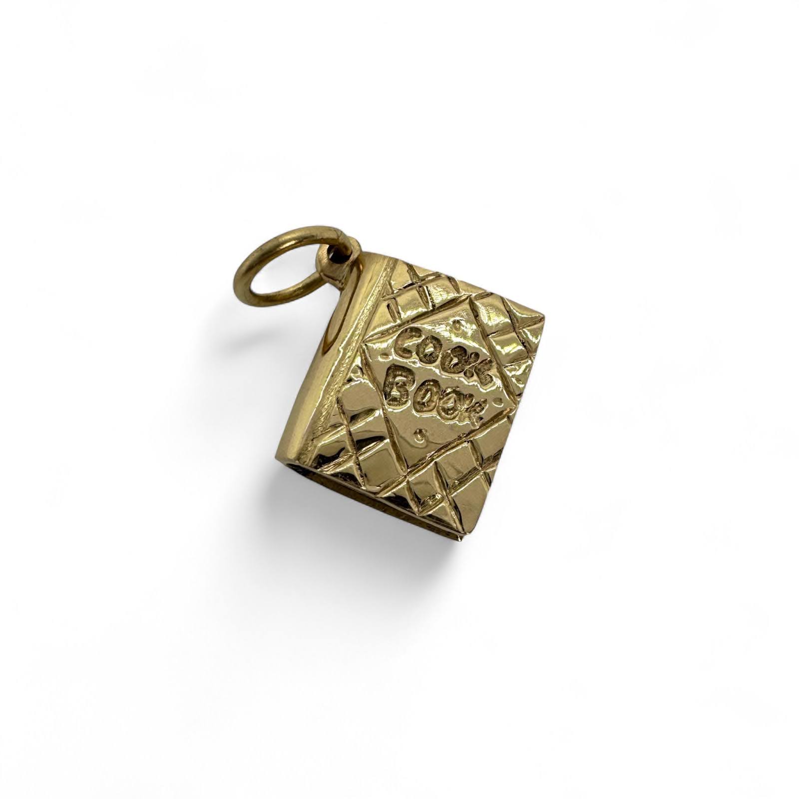 A love letter to culinary creativity, this exquisitely detailed cookbook charm celebrates the magic that happens when passion meets recipe. The hand-carved cover features intricate quilted texture and dimensional lettering that spells out "Cook Book" in charming script.